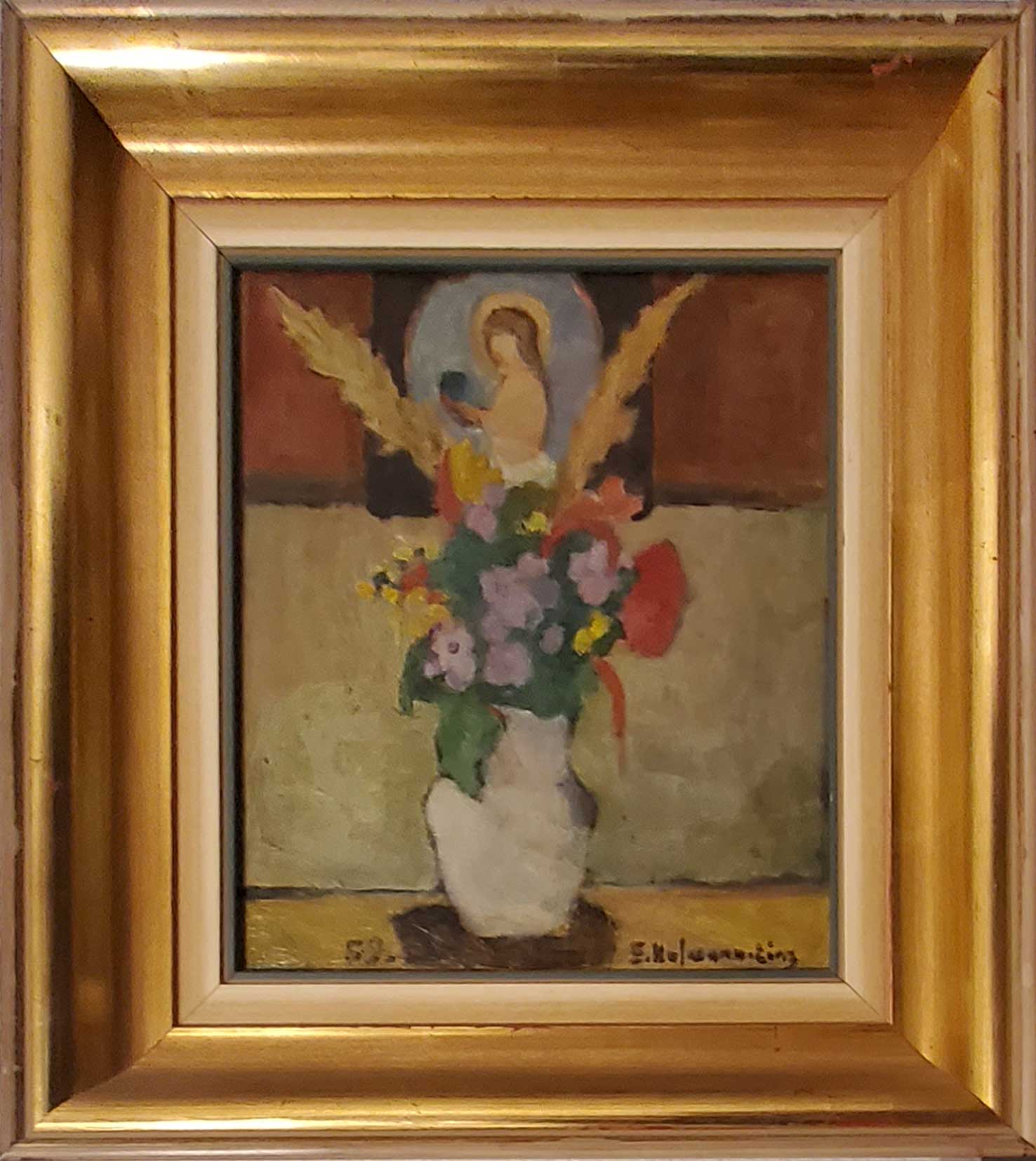 "Blumn mit Jesusbild", Öl auf Leinen, 1958, 48 x 43.5 cm , € 3100.--