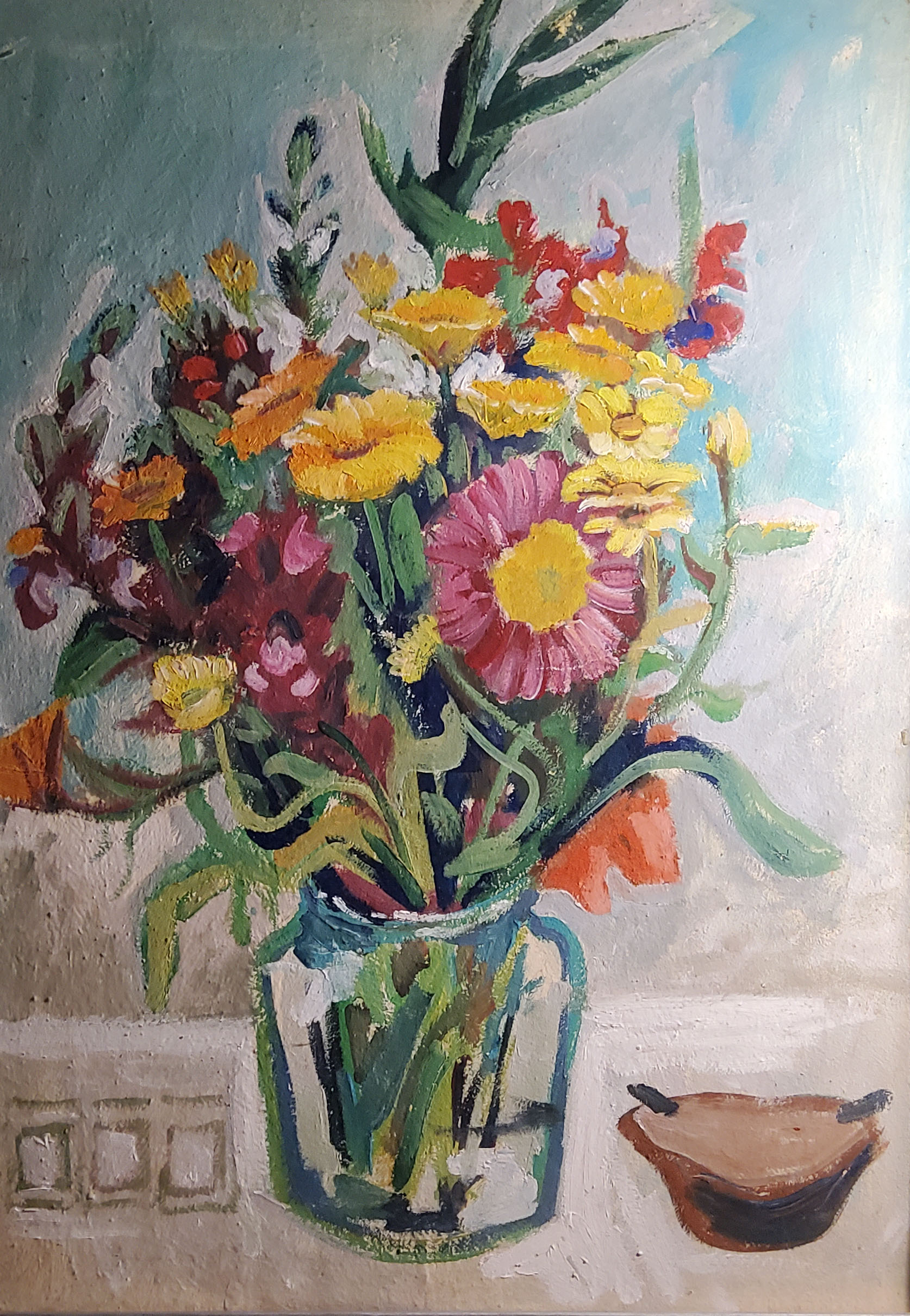 "Blumenstillleben", Öl auf Karton, nicht datiert, 90 x 69.5 cm, Bild: 73 x 52 cm , € 800.--
